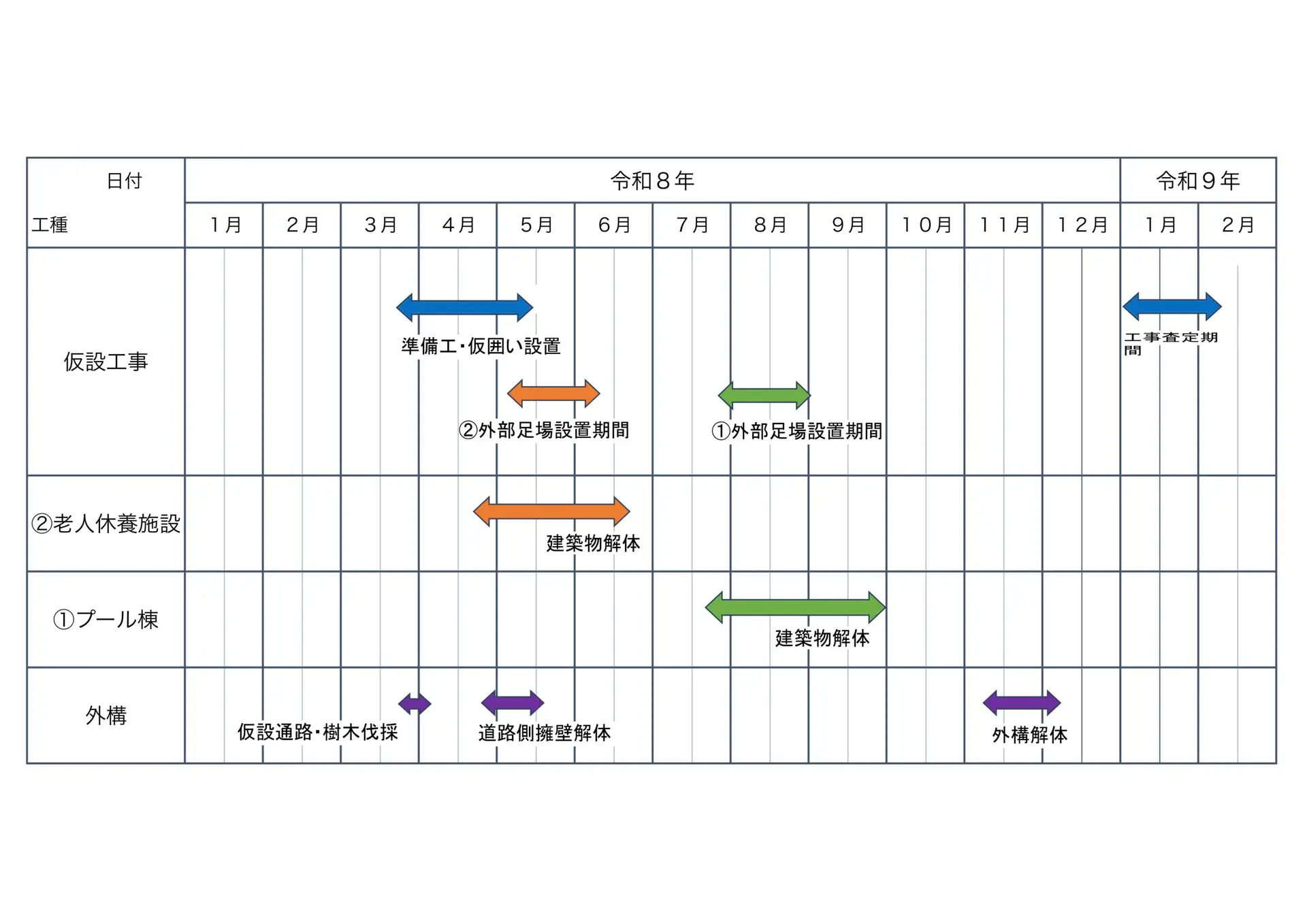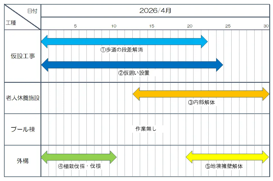 既存建物解体撤去工事について 【工事期間/作業時間/安全対策】 工事期間:令和8年3月23日から令和9年2月28日まで 作業時間:原則として平日8時から18時まで *工事用重機を使用して建物主体部分の鉄骨・コンクリート等を壊す作業は9時から17時まで*土曜・日曜・祝日は原則として休工日といたします。 *ただし、緊急時(台風、強風等が予想される場合)は休工日でも次の作業を行う場合があります。 a )建物周囲の点検作業 b )重機関係の点検 c )場内飛散物の養生 [解体撤去工事]工程表 [解体撤去工事]月間工程表